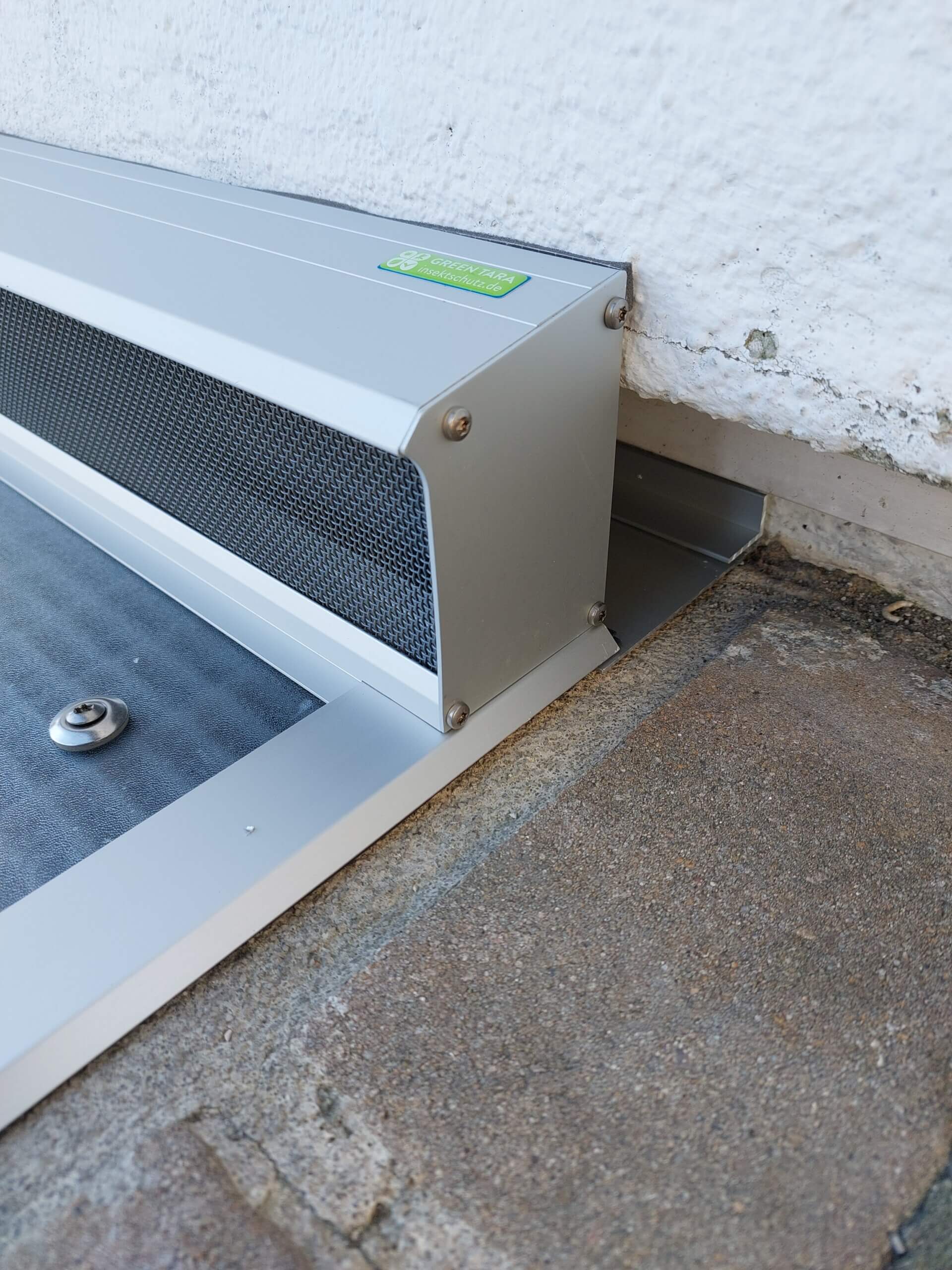 Wir haben diesen durch den Vollwärmeschutz verursachten Streifen mit einem Aluminium-Zuschnitt und Alu-Winkel abgedichtet und darauf dann die RESI montiert. Auf diesem Bild sieht man auch deutlich, dass die Fugen zwischen Pflastersteinen mit einen Kunstharzmörtel versiegelt wurde. Seither kann das Wasser nicht mehr durch die Fugen versickern. Dadurch erst ist das Problem entstanden, das wir nun mit dieser Art die RESI an die örtliche Situation zumindest entschärft haben. Niemand kann natürlich garantieren, dass nicht doch irgendwo ein Spalt offen bleibt und etwas Wasser in die Lichtschächte läuft.